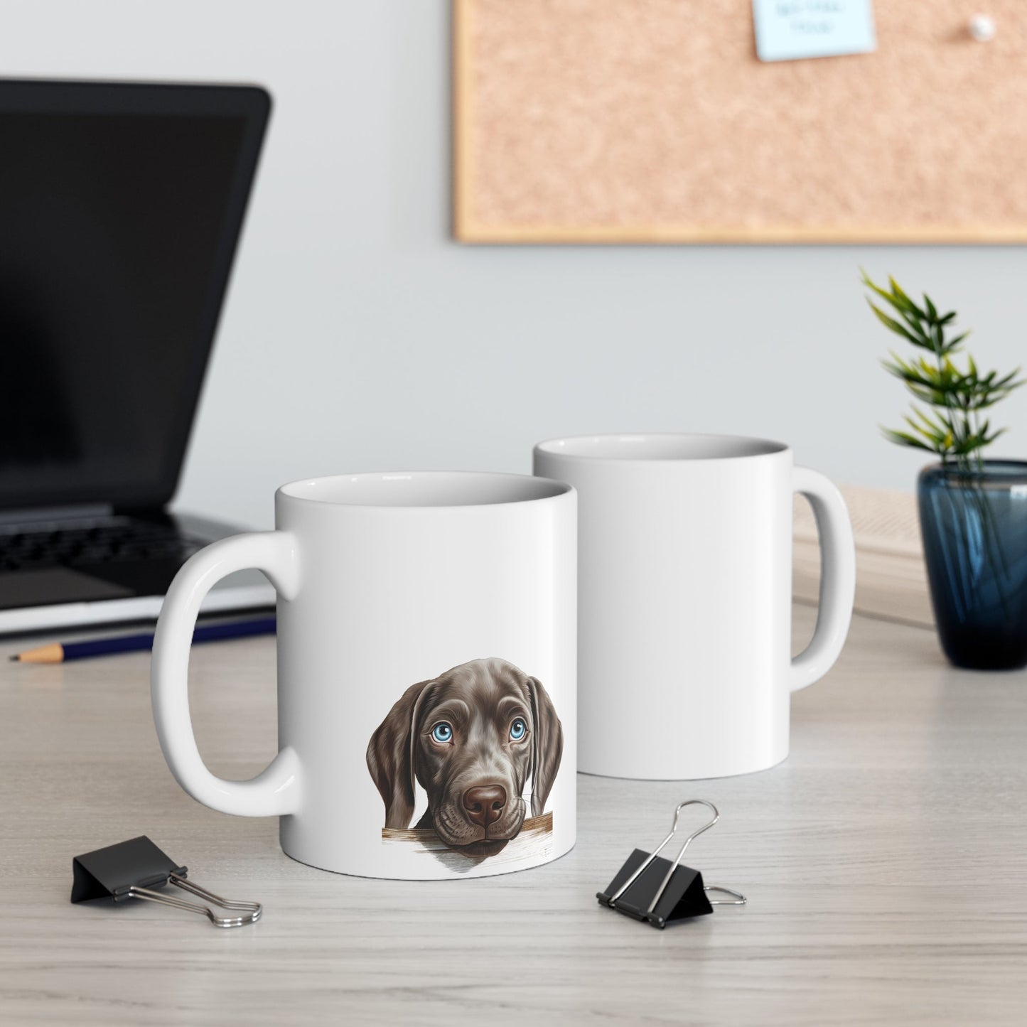 Meet your new favorite mug – a must-have for dog lovers! Kick back with your go-to drink in this awesome dog mug featuring a cute peeking Weimaraner. Crafted from sturdy ceramic, it’s not just a mug; it’s like a daily dose of dog-loving joy. Perfect for surprising the dog lover in your life, this mug combines usefulness with the charm of man’s best friend, turning every sip into a delight.