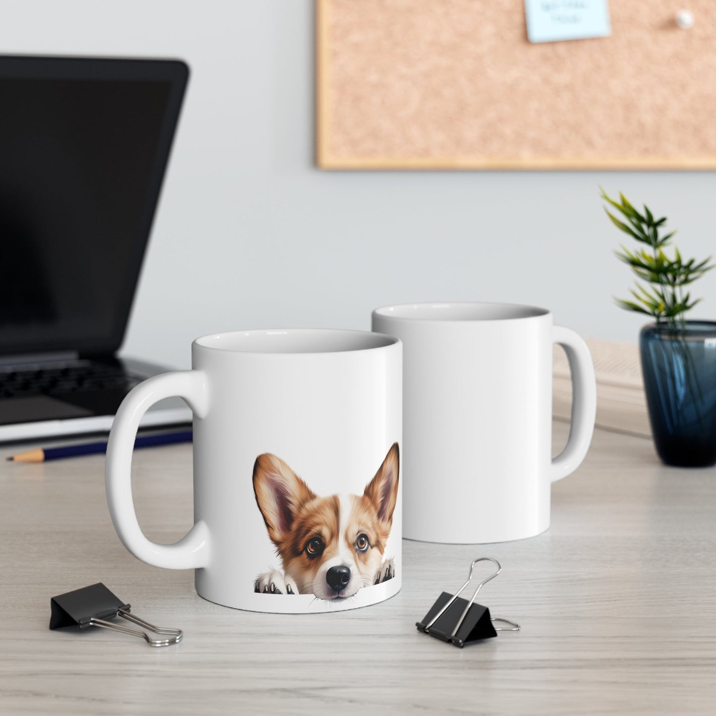 Meet your new favorite mug – a must-have for dog lovers! Kick back with your go-to drink in this awesome dog mug featuring a cute peeking Pembroke Welsh Corgi. Crafted from sturdy ceramic, it’s not just a mug; it’s like a daily dose of dog-loving joy. Perfect for surprising the dog lover in your life, this mug combines usefulness with the charm of man’s best friend, turning every sip into a delight.