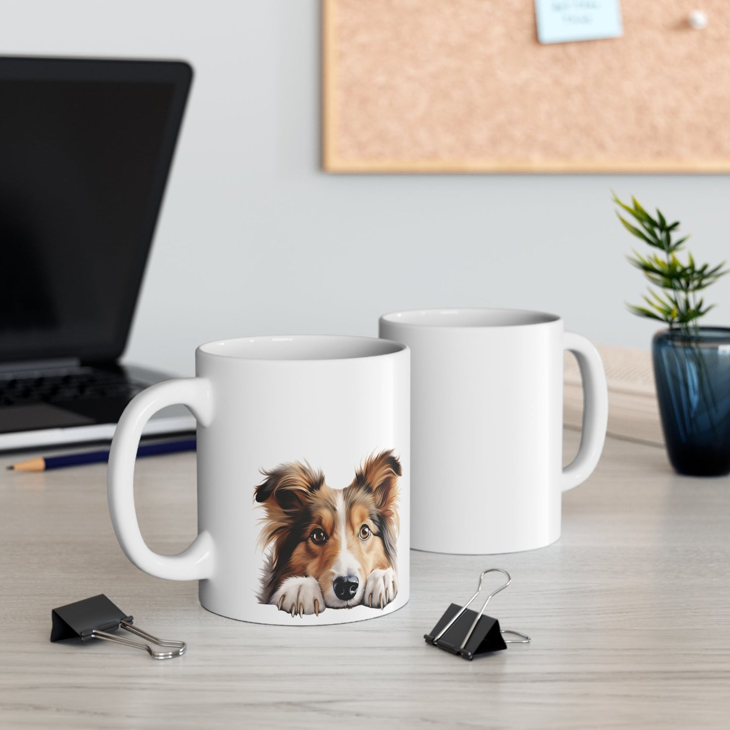 Meet your new favorite mug – a must-have for dog lovers! Kick back with your go-to drink in this awesome dog mug featuring a cute peeking Shetland Sheepdog. Crafted from sturdy ceramic, it’s not just a mug; it’s like a daily dose of dog-loving joy. Perfect for surprising the dog lover in your life, this mug combines usefulness with the charm of man’s best friend, turning every sip into a delight.