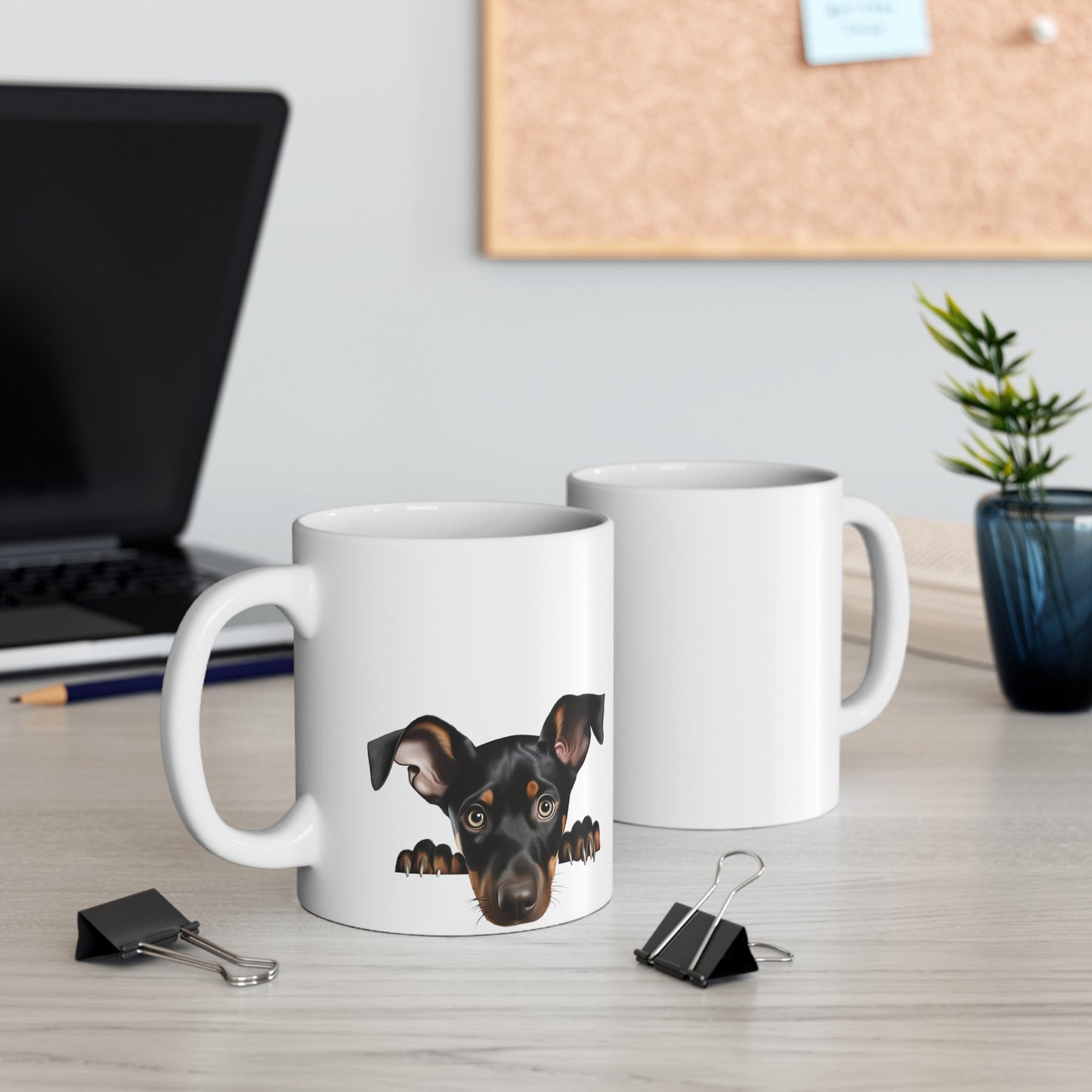 Meet your new favorite mug – a must-have for dog lovers! Kick back with your go-to drink in this awesome dog mug featuring a cute peeking Doberman Pinscher. Crafted from sturdy ceramic, it’s not just a mug; it’s like a daily dose of dog-loving joy. Perfect for surprising the dog lover in your life, this mug combines usefulness with the charm of man’s best friend, turning every sip into a delight.