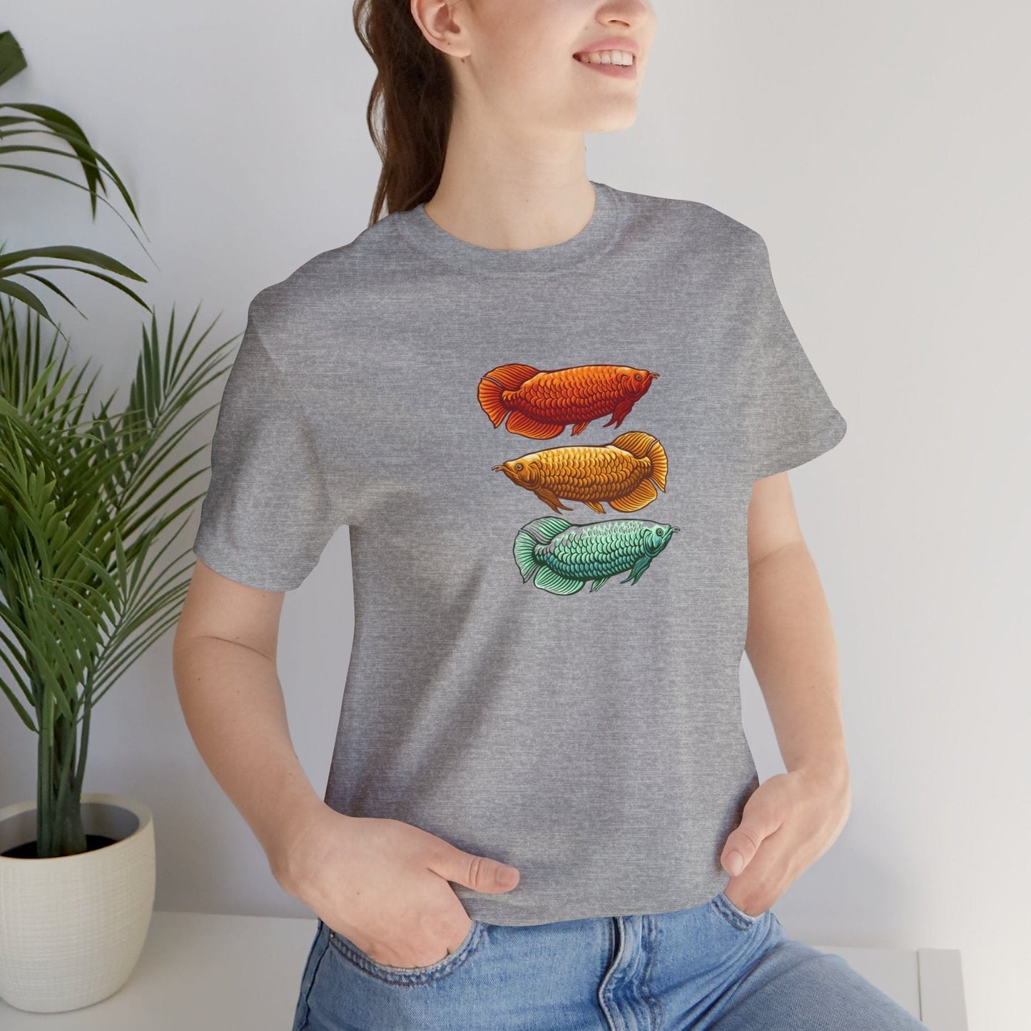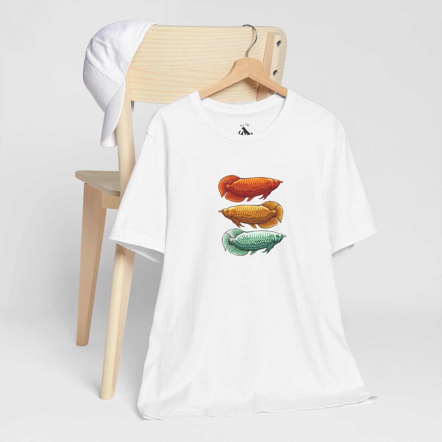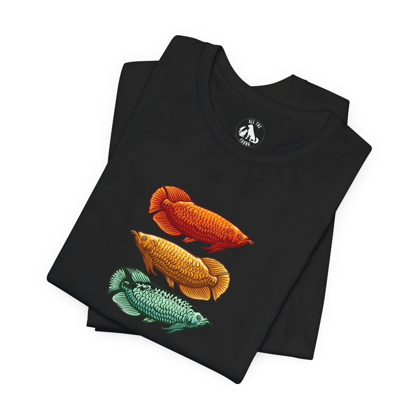 Affichez votre amour pour l'élégance aquatique avec notre t-shirt Arowana Fish ! Orné de trois poissons arowana magnifiquement détaillés imprimés sur le devant, ce t-shirt est parfait pour les amateurs de poissons qui apprécient la beauté et la grâce de cette espèce majestueuse.